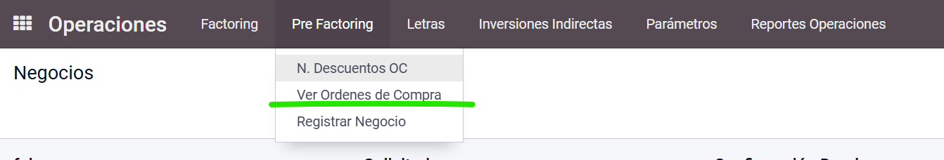 a) Accede a Odoo → Operaciones de Pre Factoring → Ver Ordenes