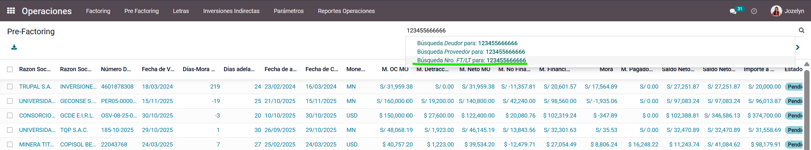 Ingreso al sistema a buscar el Pre-factoring (N° de Orden de compra) que se desea cerrar