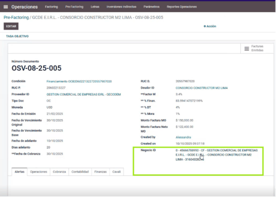 Este artículo ayuda a establecer el procedimiento que debe seguir el área de Operaciones para cerrar operaciones de prefactoring, asegurando el registro completo, la compensación correcta de la deuda y, de ser el caso, el abono del saldo a favor del cliente. 📜 Contexto .- Este flujo aplica cuando el cliente ha realizado una operación de prefactoring (financiamiento de una orden de compra). Posteriormente, el cliente factura dicha orden y envía la factura y la documentación soporte mediante el formulario de factoring. Se debe liquidar la deuda generada por la operación inicial, compensándola con la nueva factura emitida.