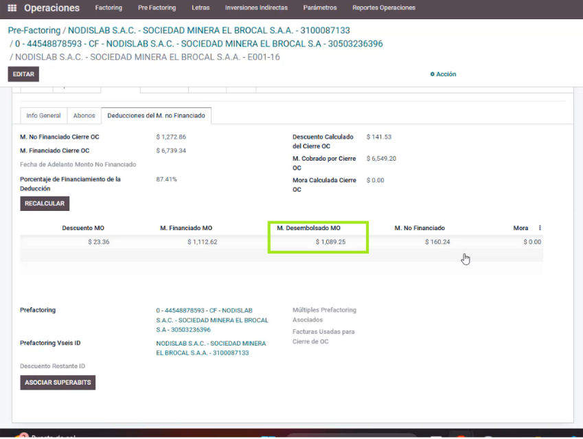 1.M.Cobrado por Cierre OC .- Es el monto de cierre de prefactoring(deuda) indicada pro cobranzas