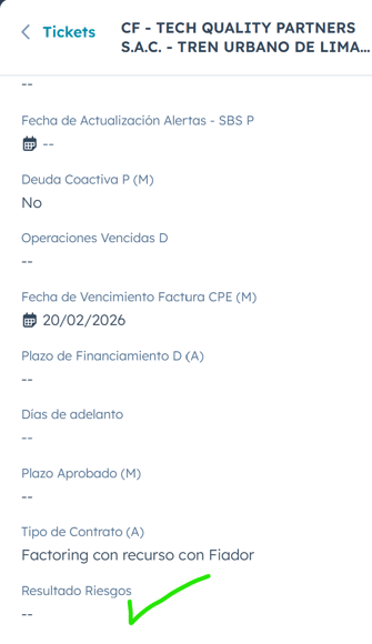 En esta etapa se revisa que el ticket sea del producto "Prefactoring" en la columna Tipo Producto y seguidamente se revisa si tiene alertas de cobranzas y/o riesgos para su consulta con las áreas correspondientes